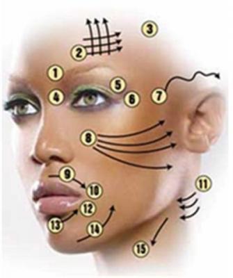 В области лица находится 8 меридианов «цзинло». Выполнение «Гуаша» по этим меридианам позволяет стимулировать биологически-активные точки, и таким образом регулировать функции соответствующих внутренних органов, циркуляцию крови энергии Ци. Массаж «Гуаша» кожи лица дает возможность непосредственного воздействия на нервные окончания эпидермиса, ускоряет их реакцию, усиливает их функции передачи нервных сигналов. Одновременно с этим происходит улучшение микроциркуляции кожи, что позволяет восполнить достаточное количество кислорода и различных питательных веществ в ней. Таким образом усиливаются регенеративные способности клеток эластина и фибробластов. Помимо этого с помощью лимфодренажа, который выполняется с учетом принципов движения лимфы, из межклеточного пространства вывоятся продукты обменаю это способствует движению кожи, улучшению ее состояния жает антиоксидантный эффект, происходит отбеливание кожи, сглаживание морщин, устранение пигментных пятен и угревой сыпи, достигается хороший